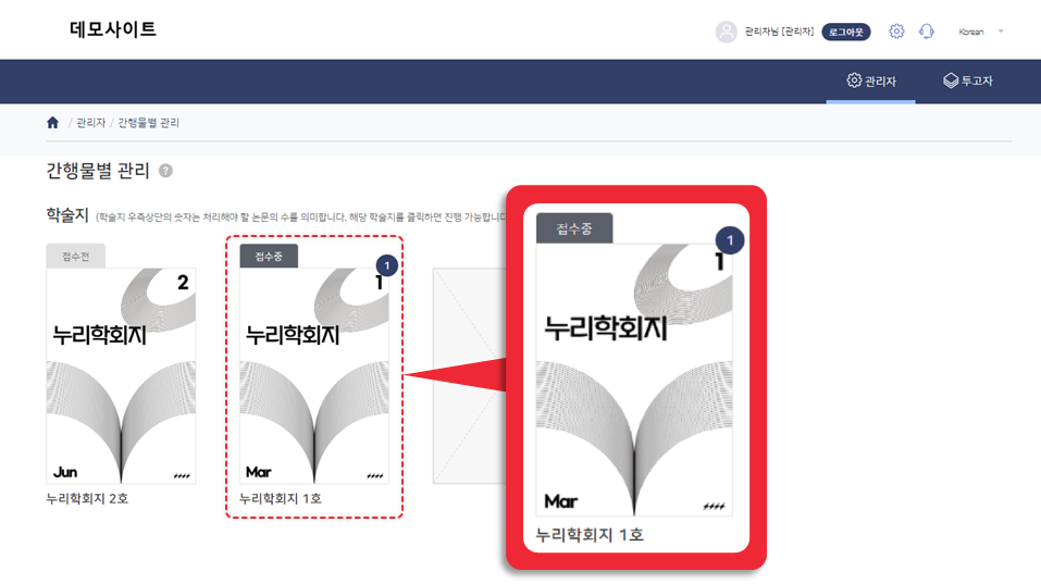 학술지별 설정에는 설정 현황표가 제공됩니다.