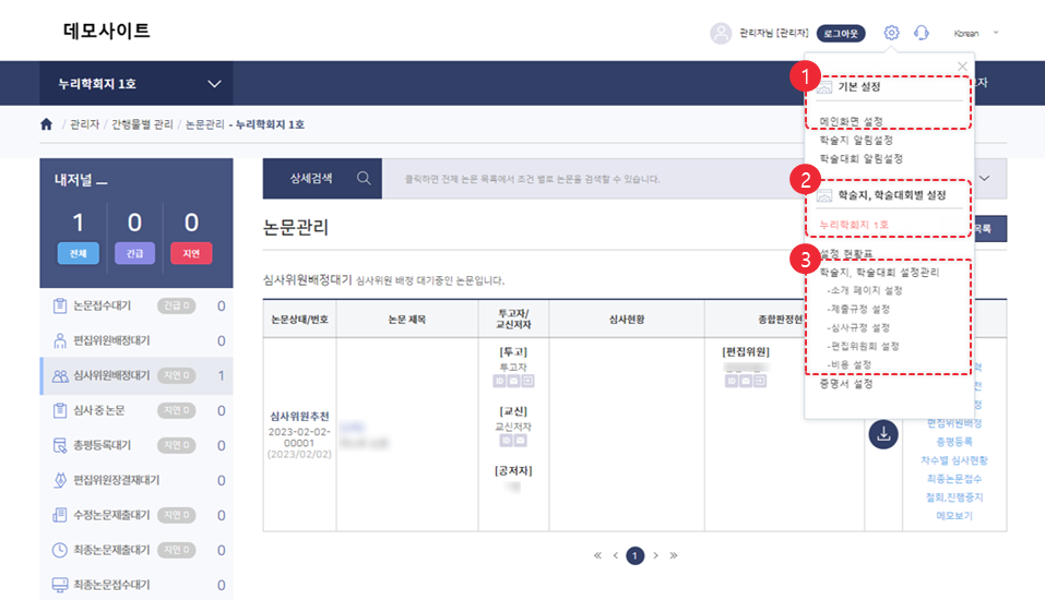 3. 설정 아이콘을 클릭하면 학술지별 설정이 활성화가 되어 있습니다.