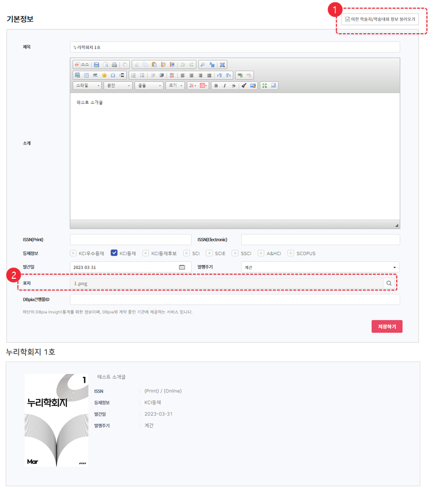 1. 한 번 이상 학술지 추가를 한 경우, 이전 학술지/학술대회 정보 불러오기를 통하여 이전에 설정했던 정보를 그대로 불러올 수 있습니다. 단, 학술지가 삭제되면 이전 정보도 삭제됩니다.