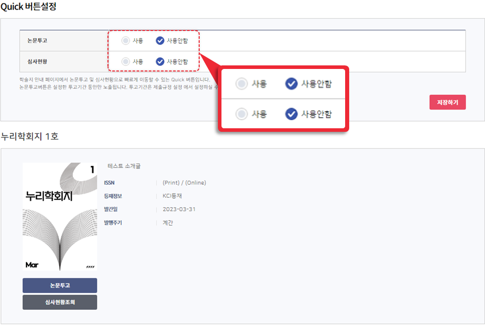 4. Quick 버튼을 사용하면 학술지 안내 화면에 노출됩니다.