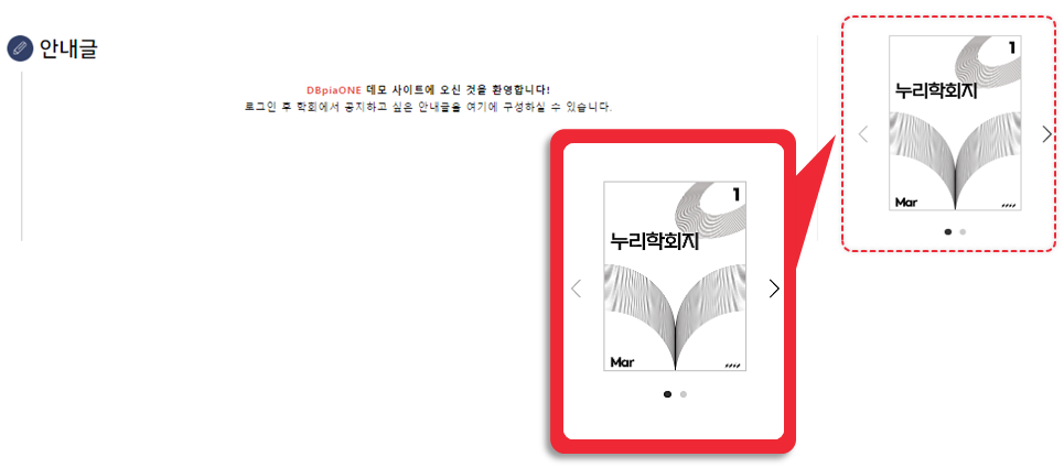 5. 학술지 안내 화면은 메인화면 안내글 우측 표지를 클릭하면 접속이 가능합니다.