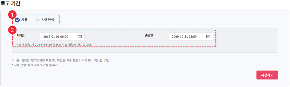 상시 접수인 경우 사용안함, 정해진 투고 기간이 있는 경우 사용에 선택합니다.
