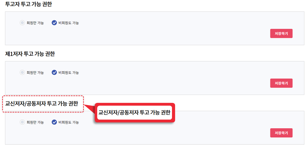 투고규정에 따라 권한 설정을 해주세요. 여기서 회원, 비회원은 홈페이지(또는 투고시스템용 회원가입 페이지)의 회원가입 여부로 구분합니다.
