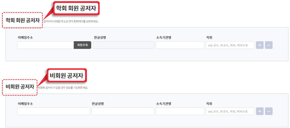 동일한 저자여도 제1저자, 교신저자 항목에 모두 정보를 입력해야 합니다.