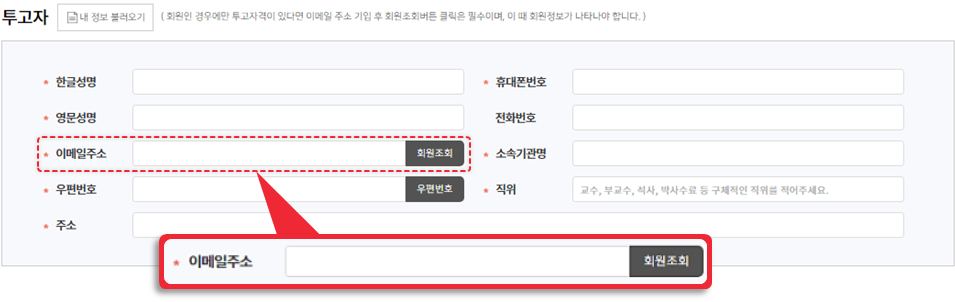 회원만 투고 권한이 있는 경우, 투고자는 이메일 조회로 회원정보를 확인해야 합니다.