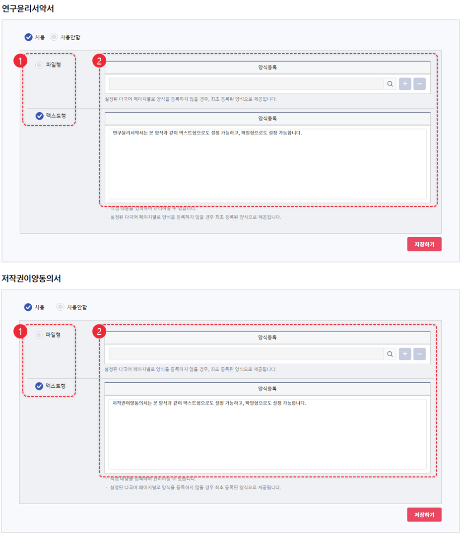 텍스트형인 경우, 규정을 텍스트로 입력합니다. 투고자가 연구윤리서약서에 특정 행위를 하는 기능은 제공되지 않으며, 동의 여부에 대한 체크만 가능합니다.