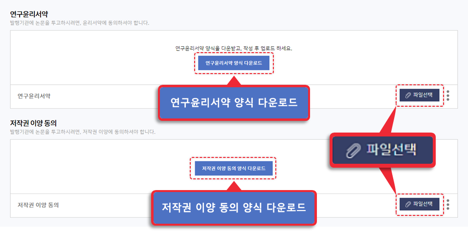 파일형인 경우, 제공 중인 양식을 업로드하면 다운로드 버튼이 노출되며 투고자는 다운로드 후 서약서를 작성하여 업로드 해야 합니다.