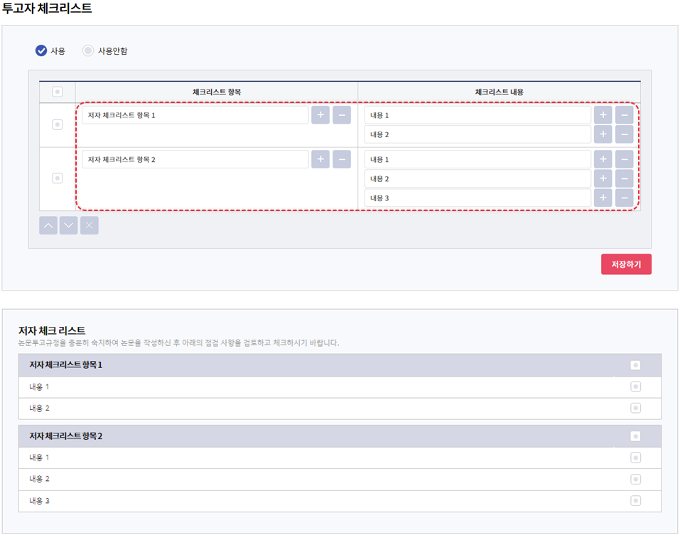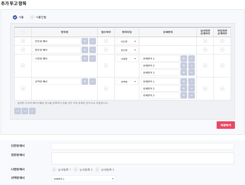 사용여부에 체크가 해제되면 심사답변서 업로드 항목이 노출되지 않으며,필수여부에 체크가 해제되면 투고자가 선택적으로 제출할 수 있습니다.
