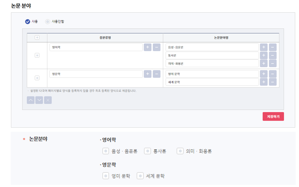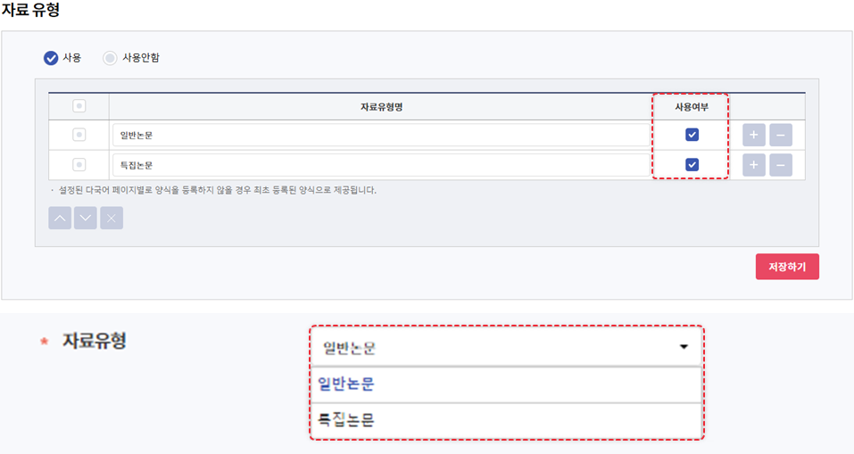 자료유형의 형태를 체크박스로 제공하고 싶으신 경우, 자료유형 관리 대신 논문분야 관리를 활용하시는 것도 가능합니다.