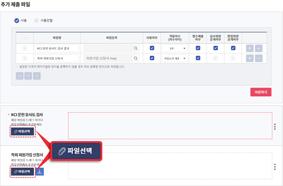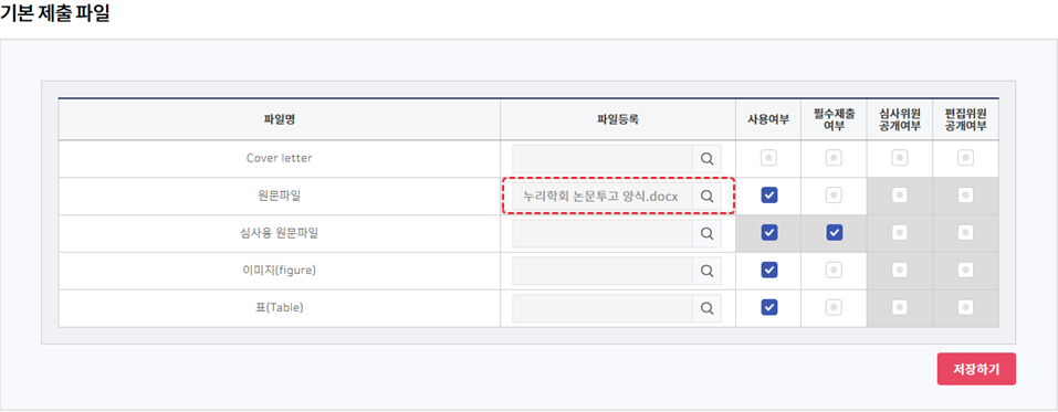 커버레터 및 원문 파일, 심사용 파일 등 기본적으로 투고자가 제출해야 할 파일의 사용여부와 필수여부를 설정할 수 있습니다.