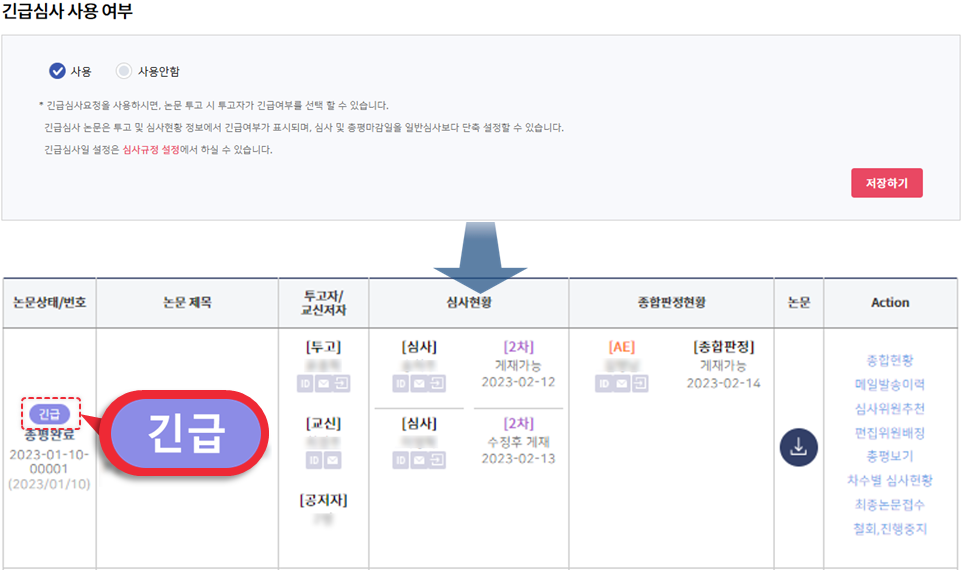 사용 시 화면에 기재된 대로 투고자는 긴급여부를 선택할 수 있으며,논문관리 목록에서 논문상태에 긴급 아이콘이 표시됩니다.