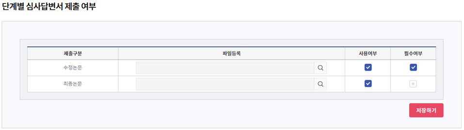 투고자가 심사답변서를 수정논문, 최종논문 제출 단계에서 제출할 수 있도록 사용여부와 필수여부를 설정합니다.