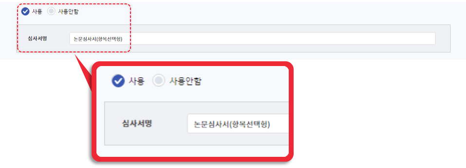 설정에 따라 모두 사용하지 않고 심사의견서 제출로 대체하기, 5가지 중 하나만 사용 또는 다수 사용하기가 가능합니다.