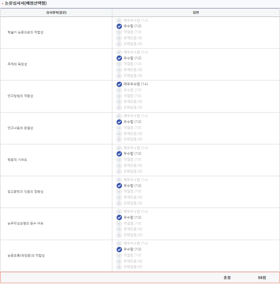 2) 심사위원별 논문심사결과 투고자 대상 공개 여부
