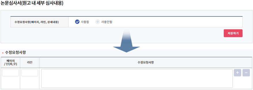 심사용논문에 기재된 페이지나 라인에 따라 어떤 부분이 수정되어야 하는지 상세하게 입력할 수 있습니다.
