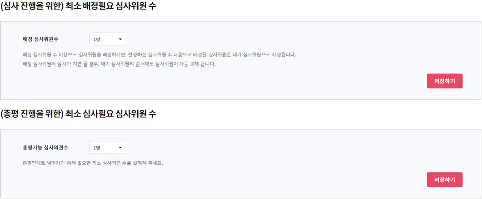 배정심사위원수는 총평가능 심사의견수와 동일하거나 적게 설정하여도 무관합니다.