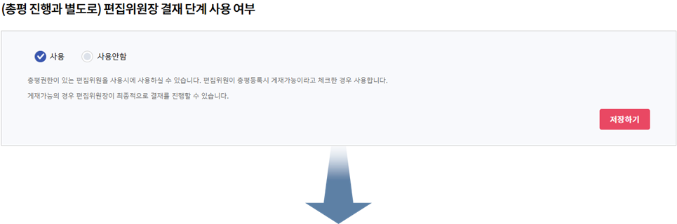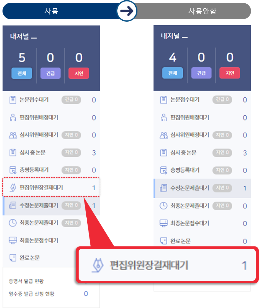 사용하지 않을 경우 편집위원장결재 대기 단계가 노출되지 않습니다.