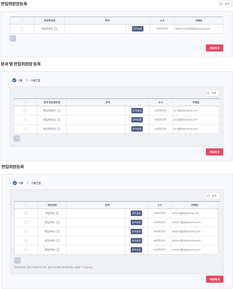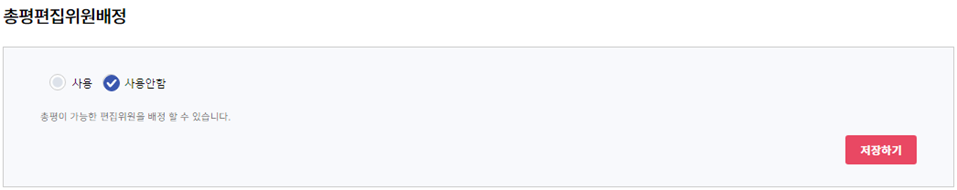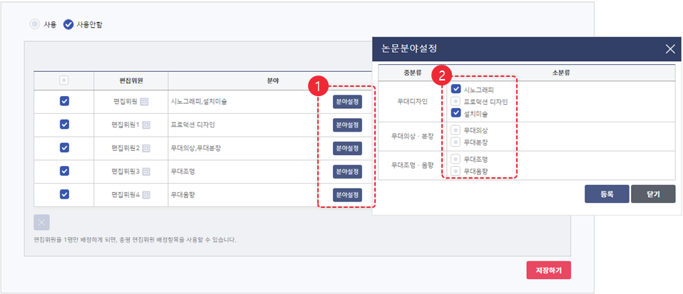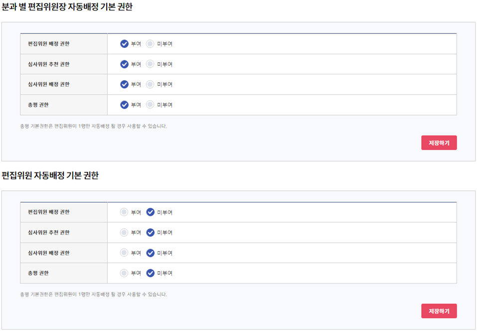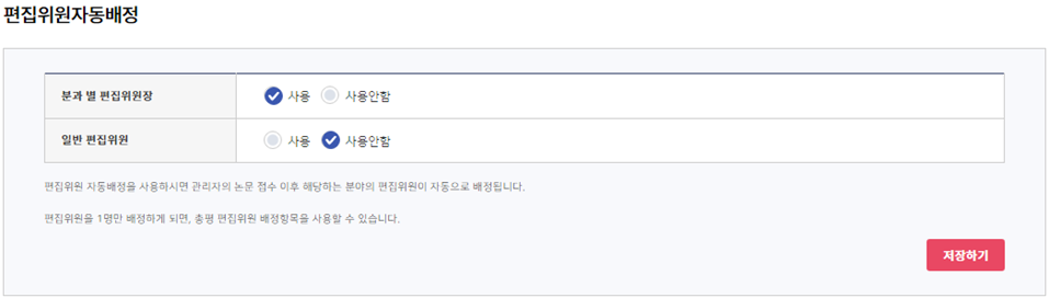 권한 내용에 따라 자유롭게 설정할 수 있습니다. 먼저 편집위원 자동배정에서 사용으로 체크해야 합니다.
