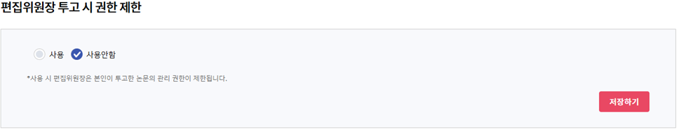편집위원장 투고 시 본인의 논문 권한을 제한하고 싶을 때는 투고하기 전에해당 기능을 사용으로 체크합니다.