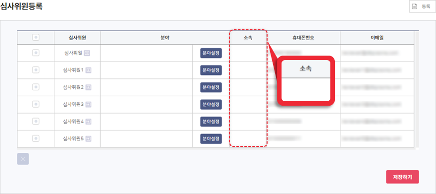 비회원 심사위원 등록 시 이름, 소속, 이메일을 필수로 입력하여야 하며, 직위와 휴대폰 번호는 선택입니다.