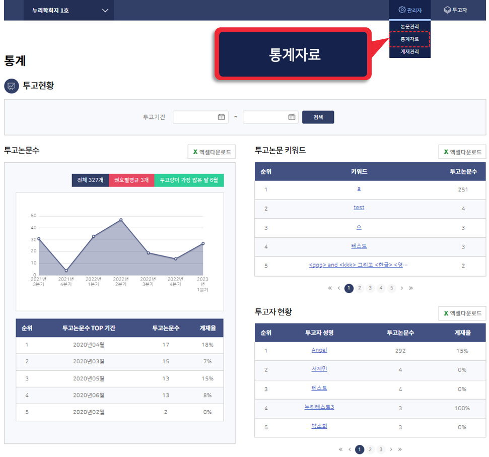 2. 통계에서 각 현황마다 기간 설정 없이 검색하면 모든 논문이 집계됩니다.
