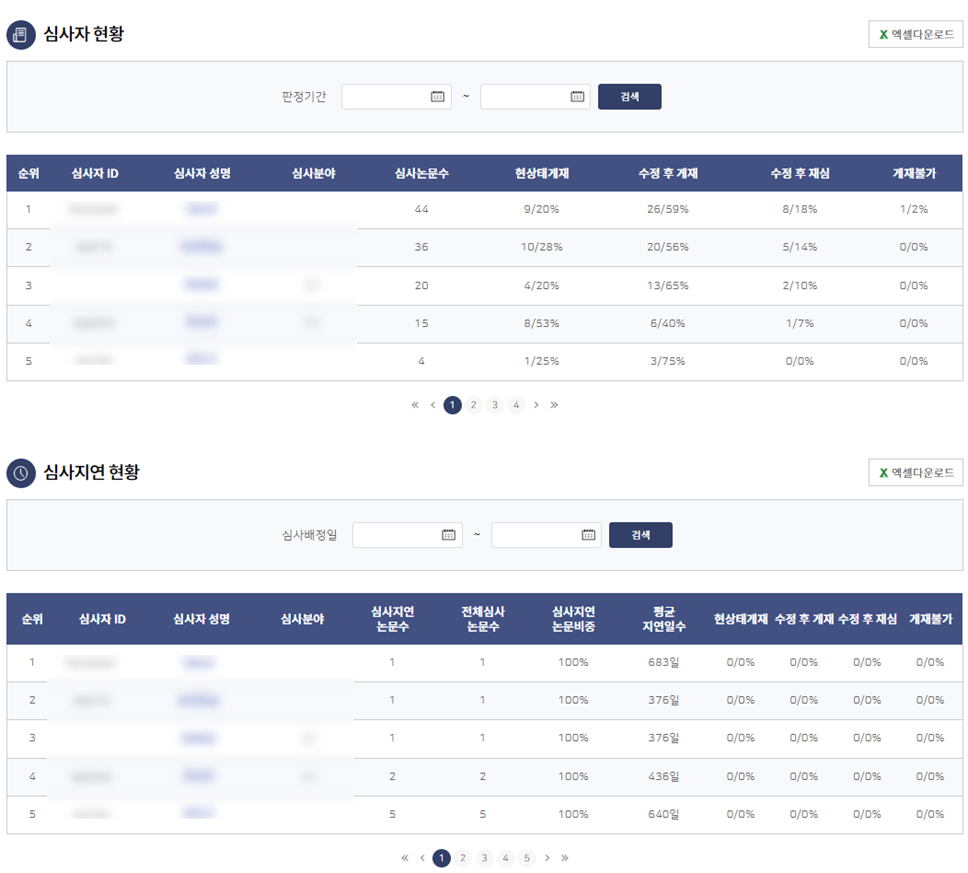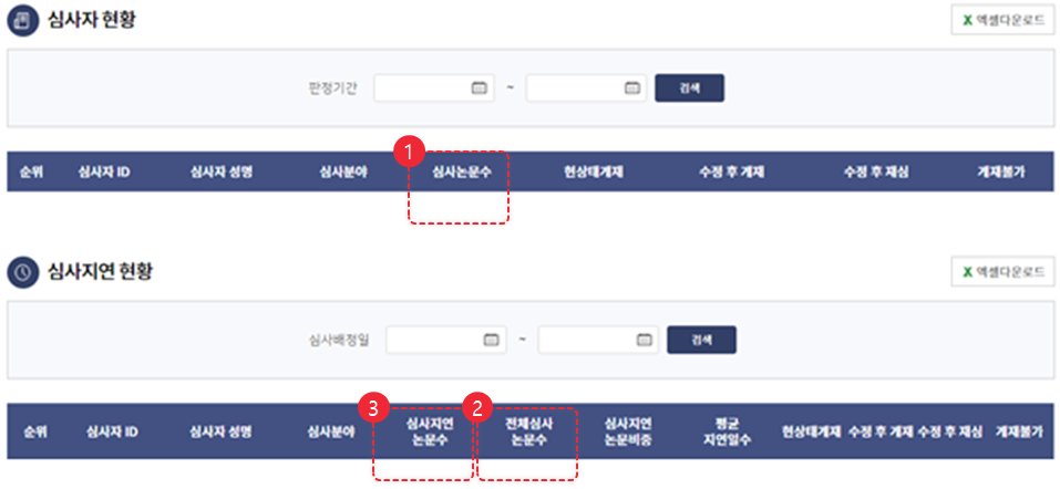 ① 심사자 현황 - 심사 논문 수: 해당 심사위원이 심사를 한 논문 수② 심사지연 현황 - 전체심사 논문 수: 해당 심사위원에게 배정된 논문 수