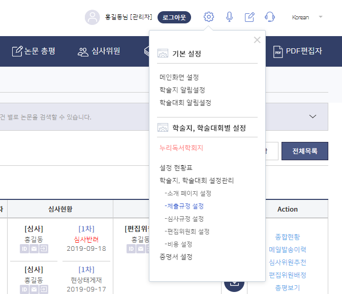 로그인 후투고자심사위원편집위원)/ 관리자의 역할 선택을 쉽게 선택하고 이동할 수 있습니다.